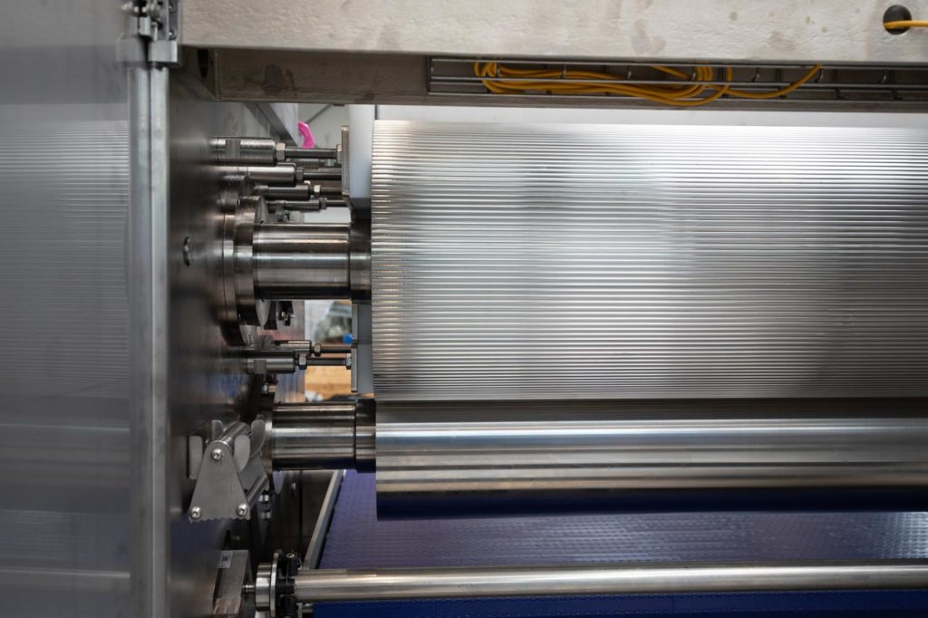 Auch im Bereich der Fertigung von Sonderwalzen haben wir uns über Jahrzehnte hinweg spezialisiert. Zum Beispiel fertigen wir für die Lebensmittelindustrie aus Vollmaterial hergestellte Walzenkörper mit tausenden 5-Achs simultan gefrästen Bohrungen, in die Stuppelstifte eingebracht werden. Die entstehende Sonderwalze ist eine zur Herstellung von Knäckebrot verwendete Prägewalze, welche eine Höhentoleranz von unter ± 0,02mm aufweist.